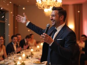 Это могут быть видео снятые как заранеев таких форматов как — интервью с сотрудниками компании, фильм о компании, юмористический сюжет с участием сотрудников в сьемке по мотивам известных фильмов и т д. А также видеоролики со сьемками в день мероприятия с сотруднками/молодоженами с просмотром также в день мероприятия по разным сценариям — например: поздравление одним словом, баблы, с использованием нейросетей, фильм о дне мероприятия, пранки со скрытой камерой и т д